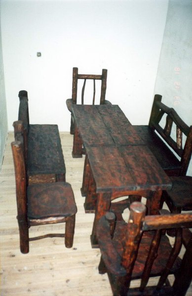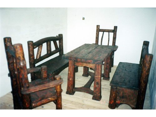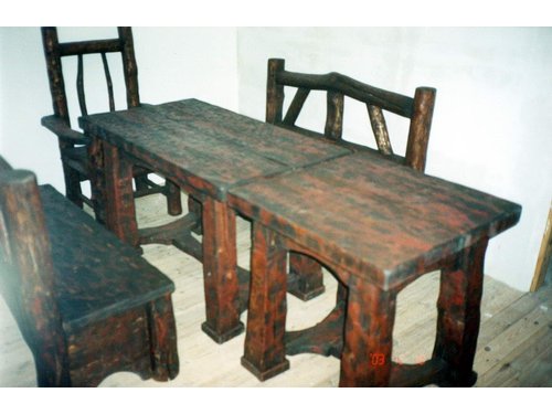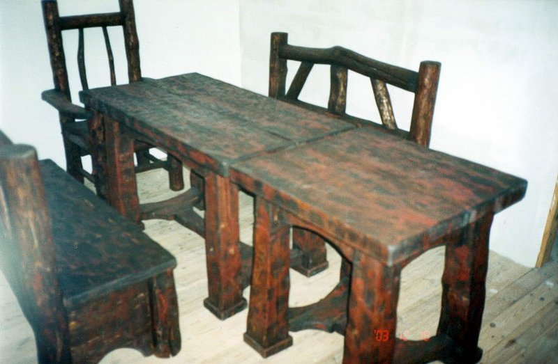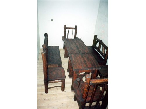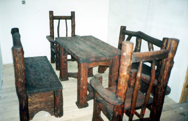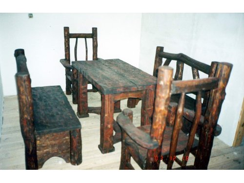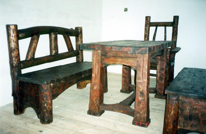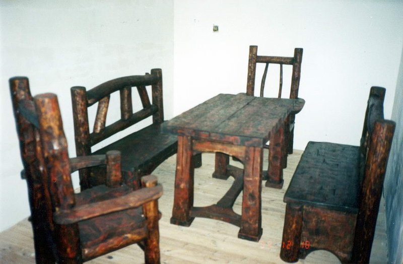 Masywny stół z dwoma ławkami i krzesłami.Styl ludowy ,wiejski,country.Projekt i wykonanie autorskie.Idealnie pasuje do restauracji,karczmy i domowego zacisza.
