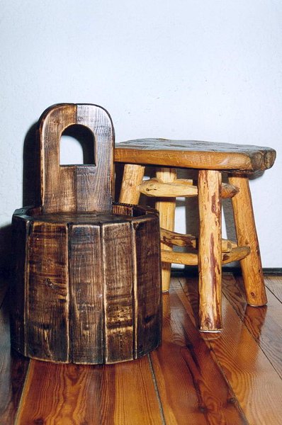 Drewniane taborety-każdy inny.W kolorze ciemnego brązu idealnie pasuje w otoczeniu kominka.W kolorze jasnym,na czterech nogach jest lekko ociosany.