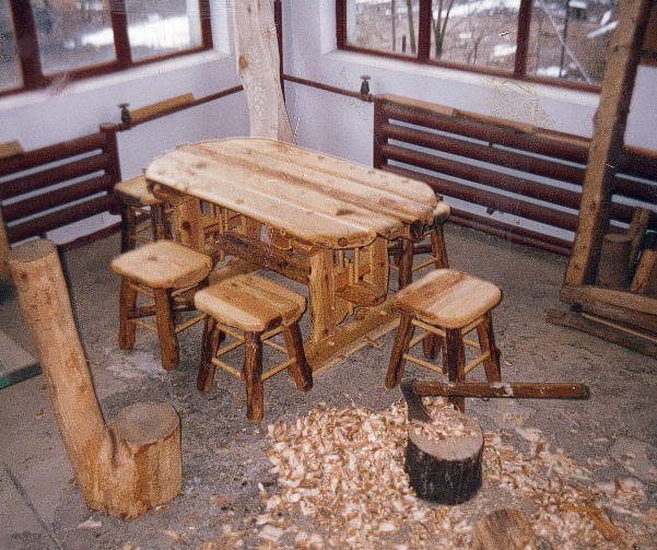 Pierwszy stół spod siekiery,który powstał w firmie.w całości drewniany,lekko ciosany .W kpmlecie taborety.Idealny do kuchni wiejskiej,ogrodu,restauracji.