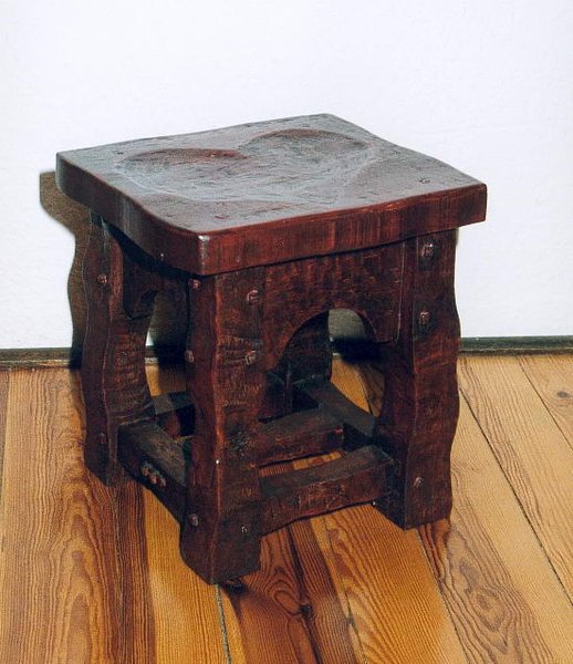 Masywny,ciężki drewniany taboret.Na siedzisku wgłębienie w kształcie serca sprawia wygodne siedzenie.