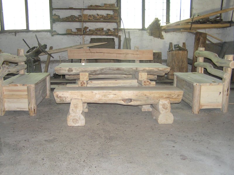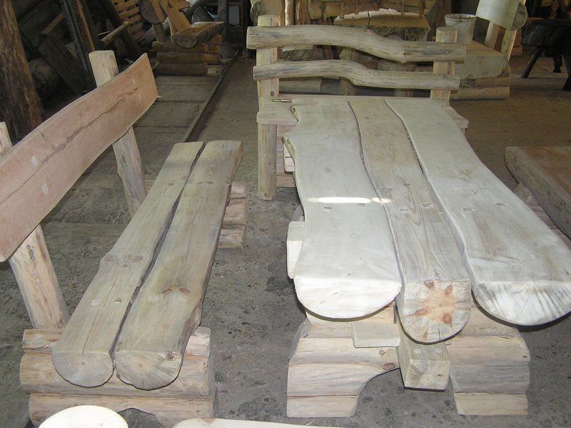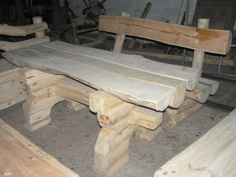 Masywny,solidny stół z ławkamioraz skrzynie oparciem.Ciosane,z litego drewna .Projekt i wykonanie autorskie.