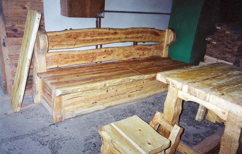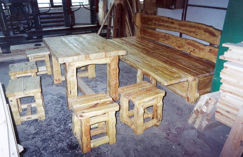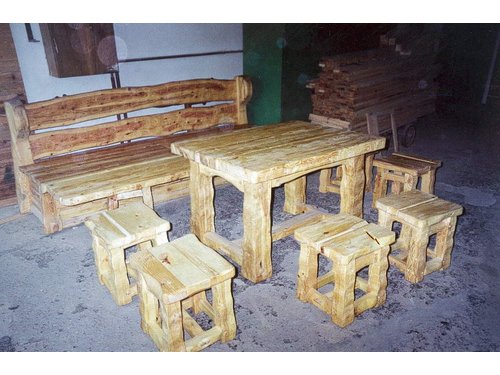 Ława z oparciem ze skrzynią.Stół z ławką i taboretami posiada wyrażnie ociosane nogi.Meble do karczmy,ogrodu,domu wiejskiego.