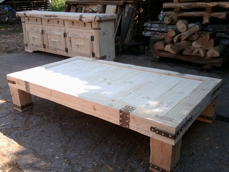 Solidny,masywny stół w stylu wiejskim ,country.W całości z litego drewna,ze skórzanymi ozdobami.Pomysł i wykonanie autorskie.