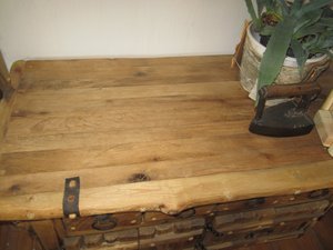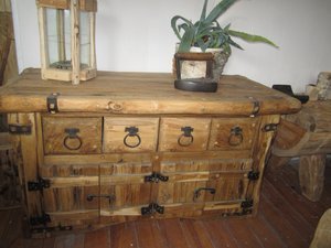 Dębowa,designerska komoda .Lite drewno w całości.Ciosana,z ozdobami skórzanymi i metalowymi zawiasami i uchwytami,ręcznie kutymi.Pomysł i wykonanie autorskie.Wymiary 120 cm x 57 cm x 63 cm