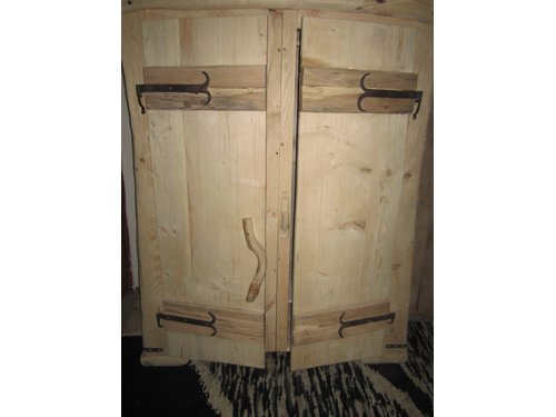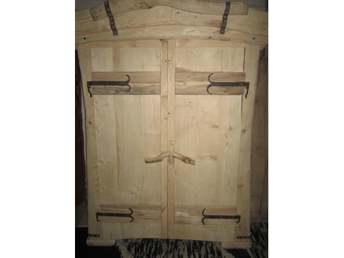 SZAFA Z LITEGO DREWNA W STYLU COUNTRY.Wykonana z sosny z dębowymi ozdobnymi deskami na drzwiach.POSIADA RĘCZNIE KUTE ZAWIASY.Wymiary 145 cm szerokość60 cm głębokość 208 cm wysokość