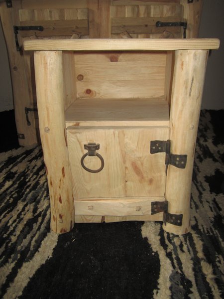 Sosnowa , drewniana szafka nocna . Zawiasy i uchwyt w kształcie koła są metalowe i ręcznie kute . Wymiary Wysokość 60 cm szerokość 48 cmgłębokość 48 cm