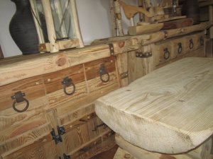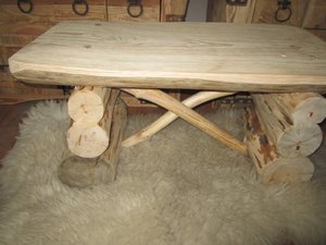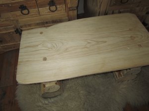 STOLIK KAWOWY .Wykonany z sosny i świerku.Blat gruby, prostokątny, o nierównych krawędziach.